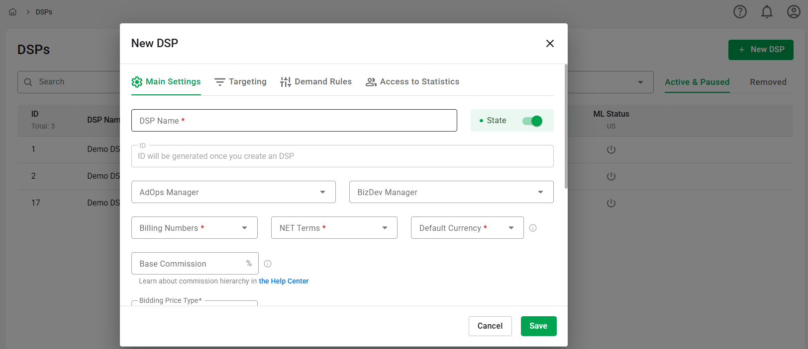 On the DSPs tab click the 'New DSP' button in the upper right corner. On the opened modal window fill in the Main Settings first, then proceed to Targeting, Demand Rules and Access to Statistics.