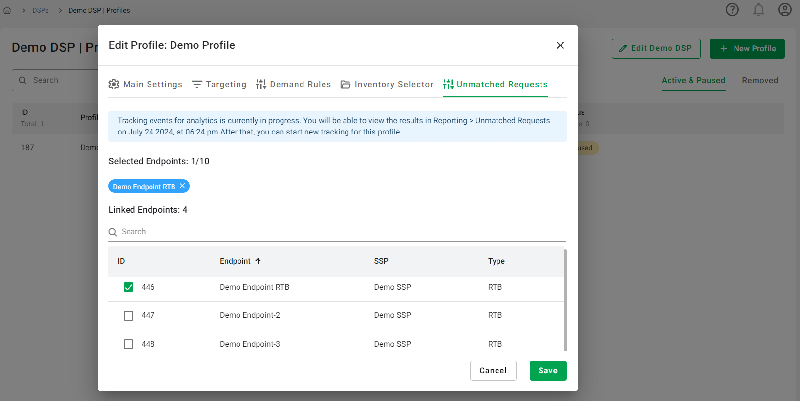 In the Edit Profile window, you'll find the Unmatched Requests tab. This feature allows you to log and analyze unmatched requests. To initiate logging, you need to select the Endpoints for a specific Profile and then click the Save button. Once you've made your selection and saved it, we will begin tracking events for analytics.
