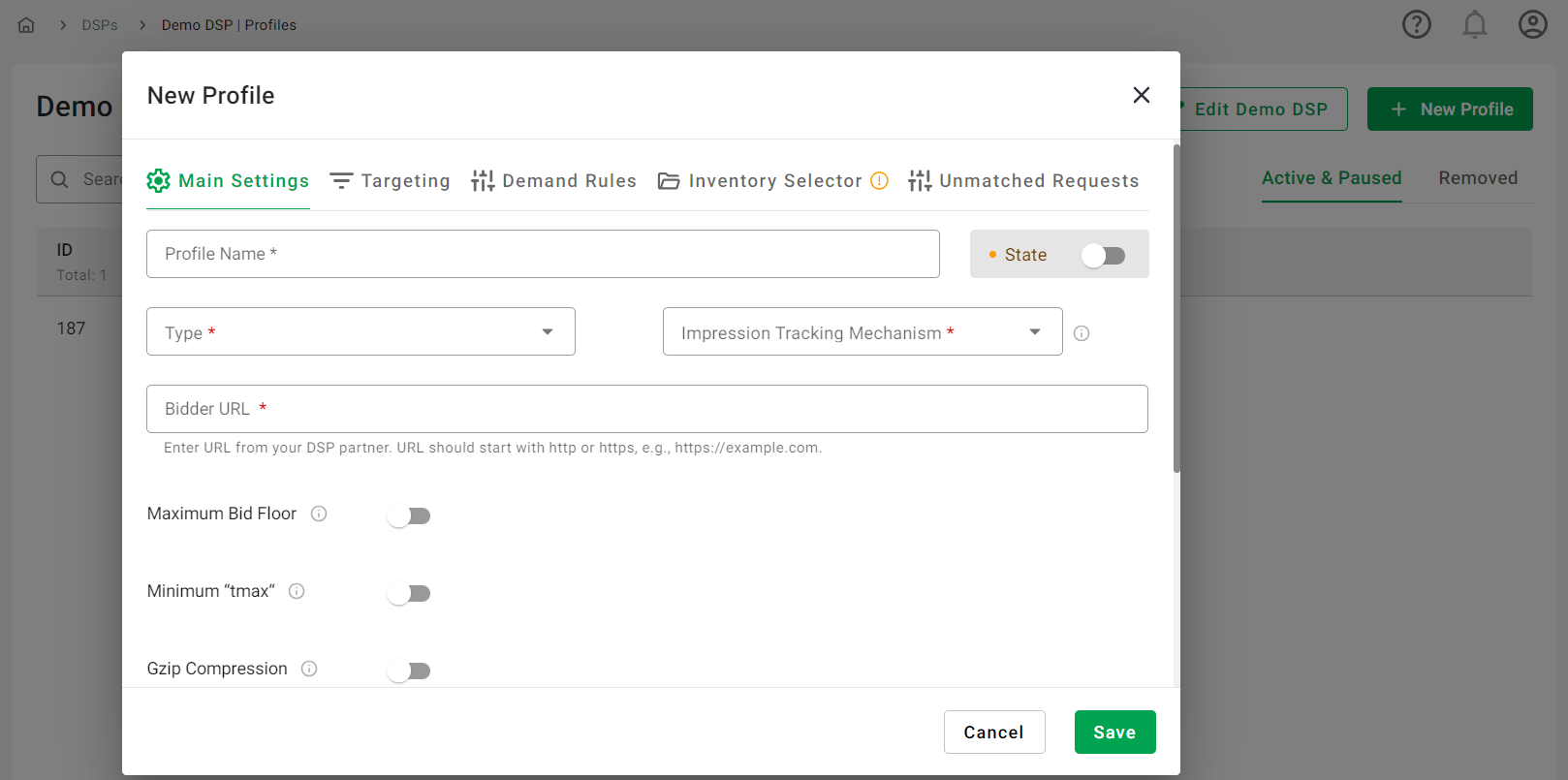 - State: Toggle the profile state between Active and Paused. The profile's state will automatically inherit the state of the DSP it is associated with.