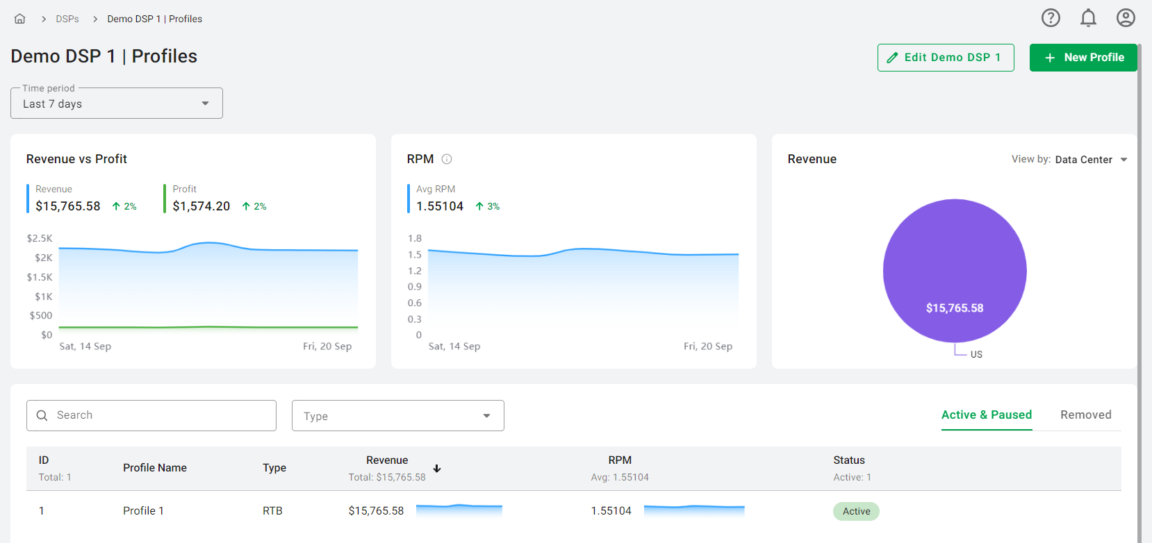 DSP profiles are configurations within DSPs that specify rules for bid requests sent to DSPs. The Profiles tab provides a comprehensive view of each profile's performance metrics, such as Revenue and RPM (Revenue Per Mille). Revenue represents the total earnings generated from ad impressions, and under the Revenue column, the total revenue for all profiles is displayed. RPM, which measures the revenue earned per 1,000 sent opportunities, also has a column that displays the average RPM for the DSP (not the aggregate of its individual profiles). The tab includes graphical representations of Revenue and RPM trends for the selected time period, allowing you to analyze daily data points when hovering over the graphs.
