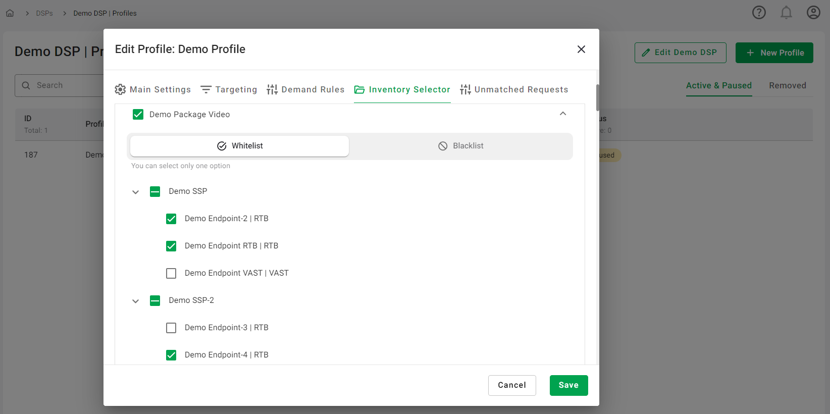Choose one or more packages to link inventory. Each package includes several endpoints organized by SSPs. You can select an entire SSP with its endpoints or individual endpoints. Utilize the blacklist or whitelist options to exclude specific SSPs/endpoints or include only the selected ones.