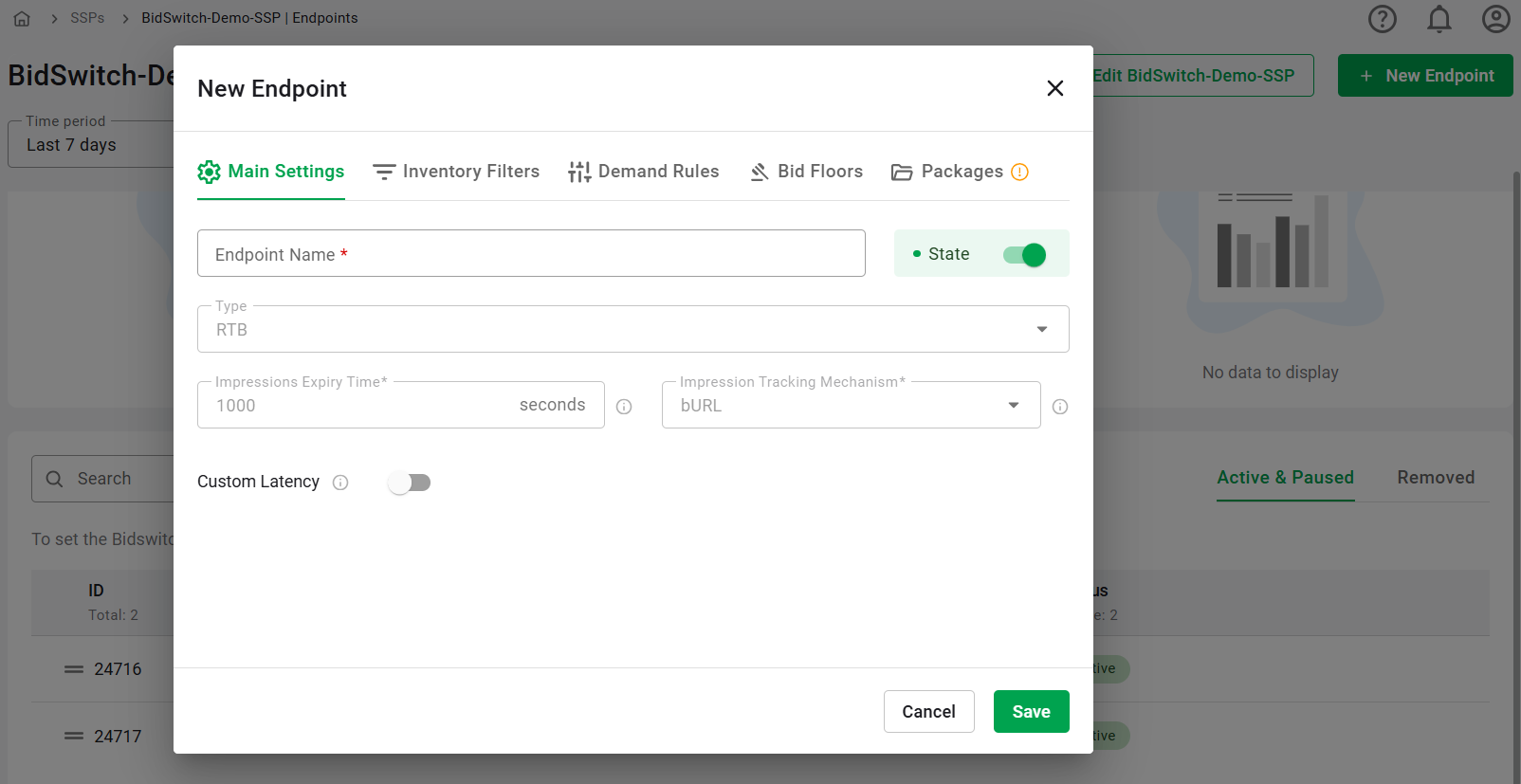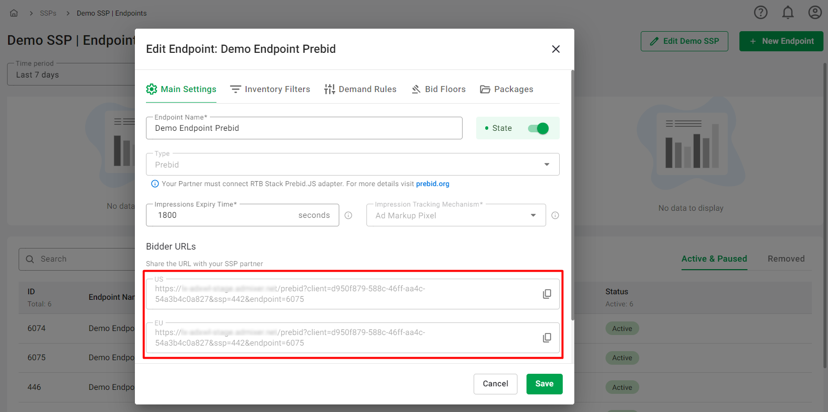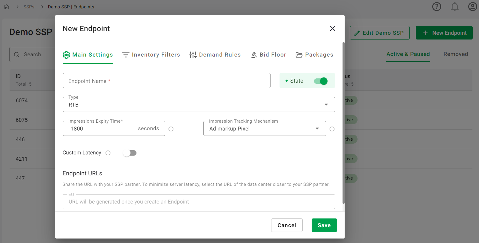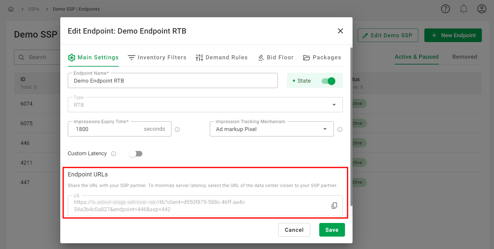 - State: This toggle indicates the state of the endpoint. It can be Active, Paused, or Paused with the toggle disabled for paused SSPs.