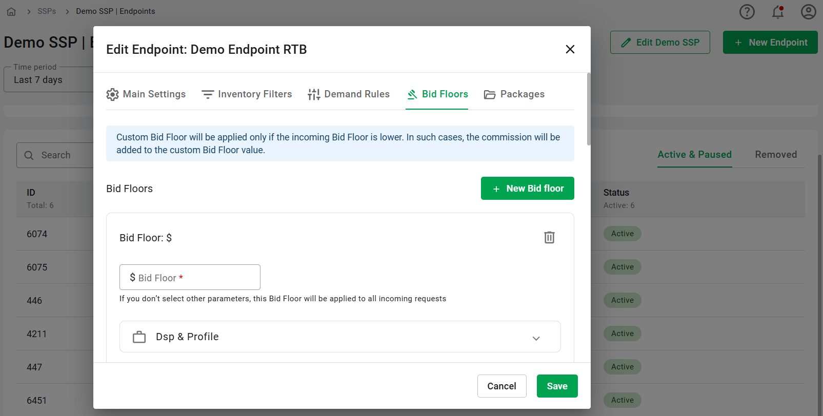 Users can add an unlimited number of bid floors, but each must be added individually. During this process, users specify which Demand Side Platforms (DSPs) and profiles the bid floor applies to, along with various parameters. These parameters help refine the bid floor's application to specific impression opportunities. The parameters include: