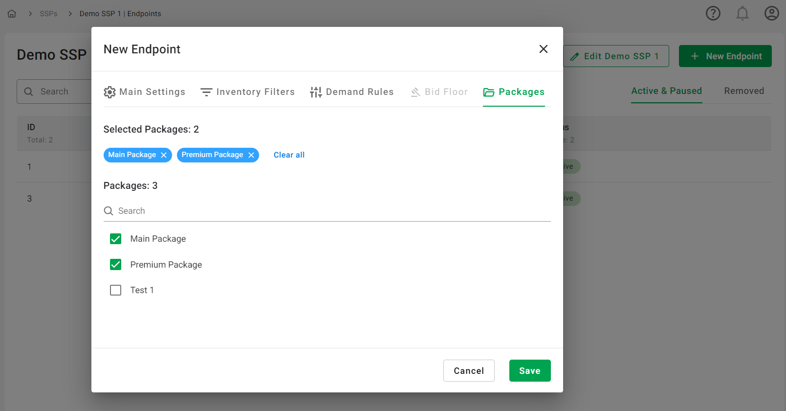 To enable access to Endpoints at the Profile level, they need to be included in at least one Package. A Package is a collection of Endpoints grouped according to specific business logic, such as differentiating between Premium sources and those of lower quality. For more information about Packages, please visit this page.To associate an Endpoint with a particular Package (or multiple Packages), simply find it (you can use the search function), select the checkboxes, and click Save.