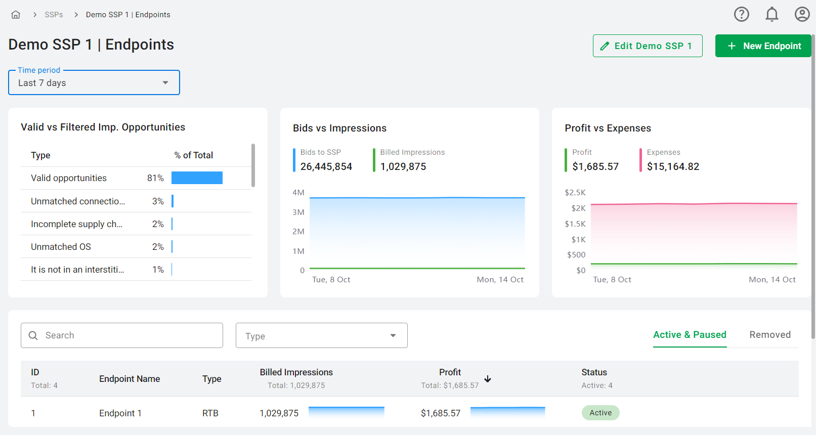 Under each SSP, you will find a list of its endpoints. An endpoint refers to a specific URL where the partner SSP sends bid requests. This tab displays key statistics, including Billed Impressions and Profit, to help you analyze performance effectively. The Billed Impressions and Profit columns feature interactive graphs on the right side, which provide data for the selected time period in the dropdown menu above the table. Hovering over the graphs allows you to view specific daily data points.