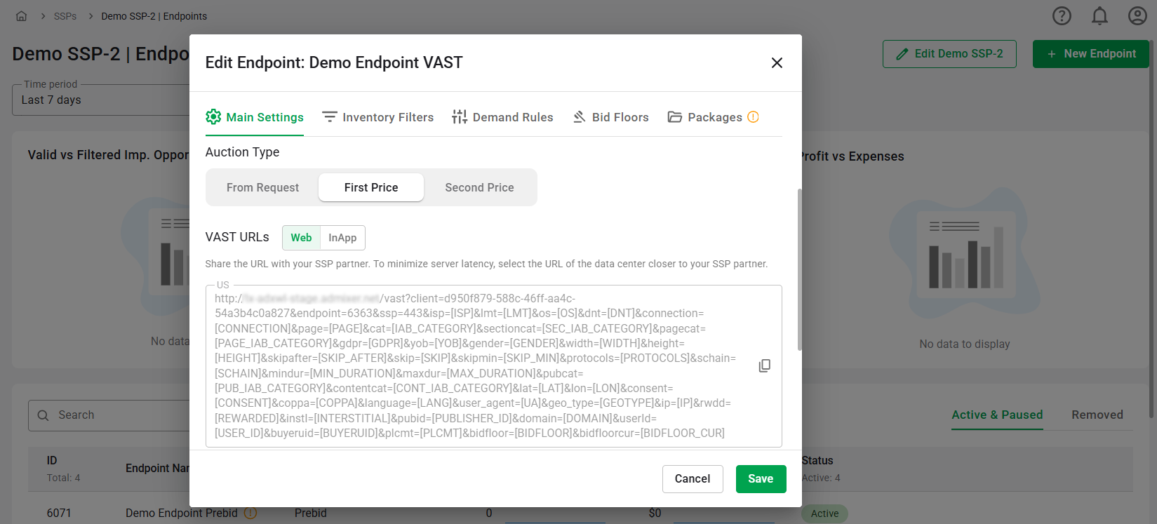 - VAST URLs: These will be available once the Endpoint is created and saved. Share the URLs with the SSP partner, selecting URLs of datacenters that are closer to your partner.