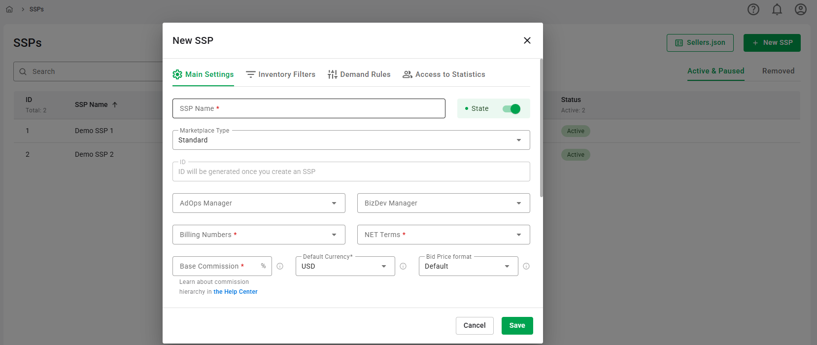 On the SSPs tab click the 'New SSP' button in the upper right corner. On the opened modal window fill in the Main Settings first, then proceed to Inventory Filters, Demand Rules and Access to Statistics.