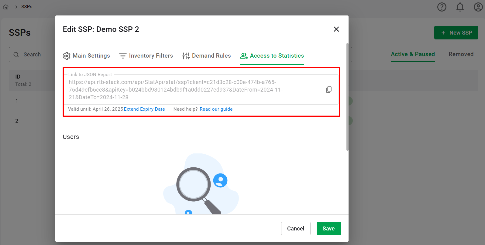 Upon SSP or DSP creation, an API link is automatically generated. You can locate it by navigating to the DSP/SSP settings, specifically the Access to Statistics tab.