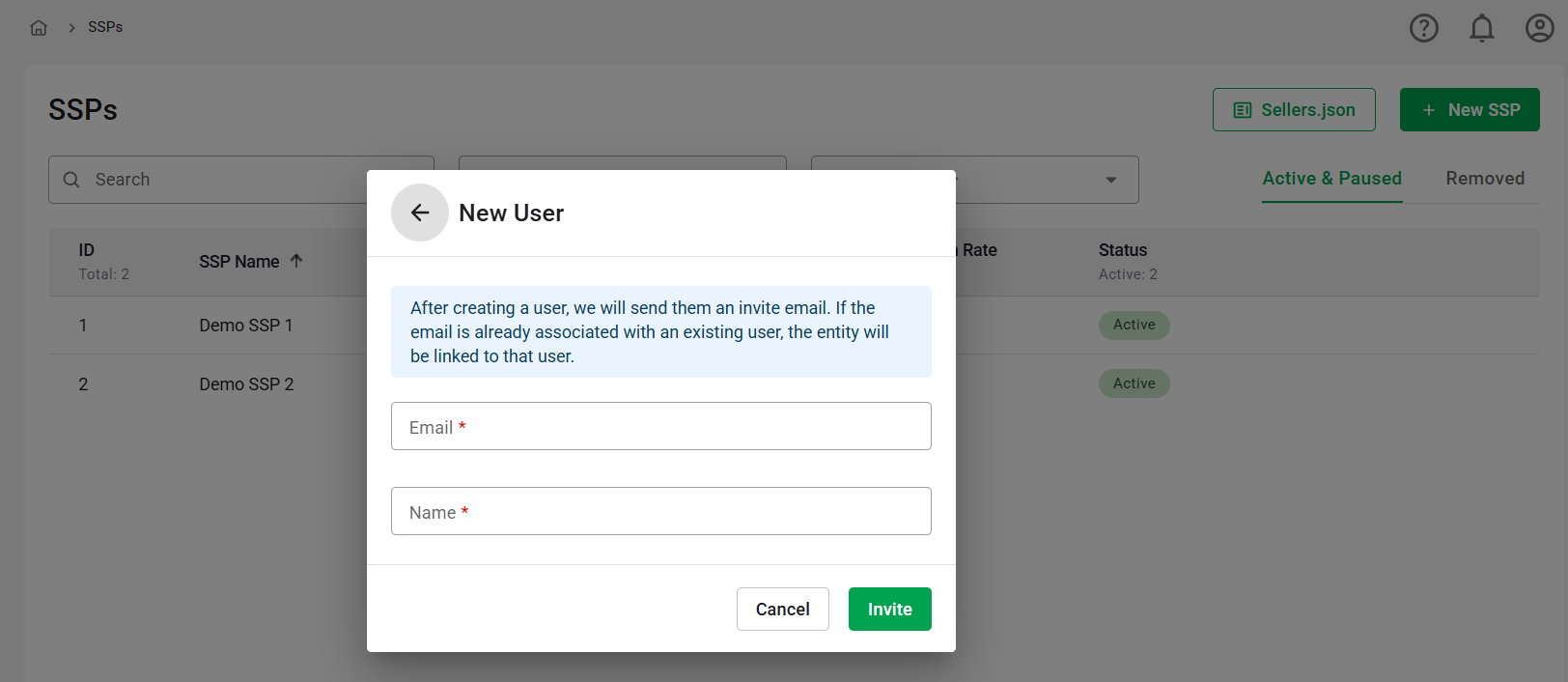 After creating an SSP or DSP, there are two (2) options available for sharing statistics with partners: