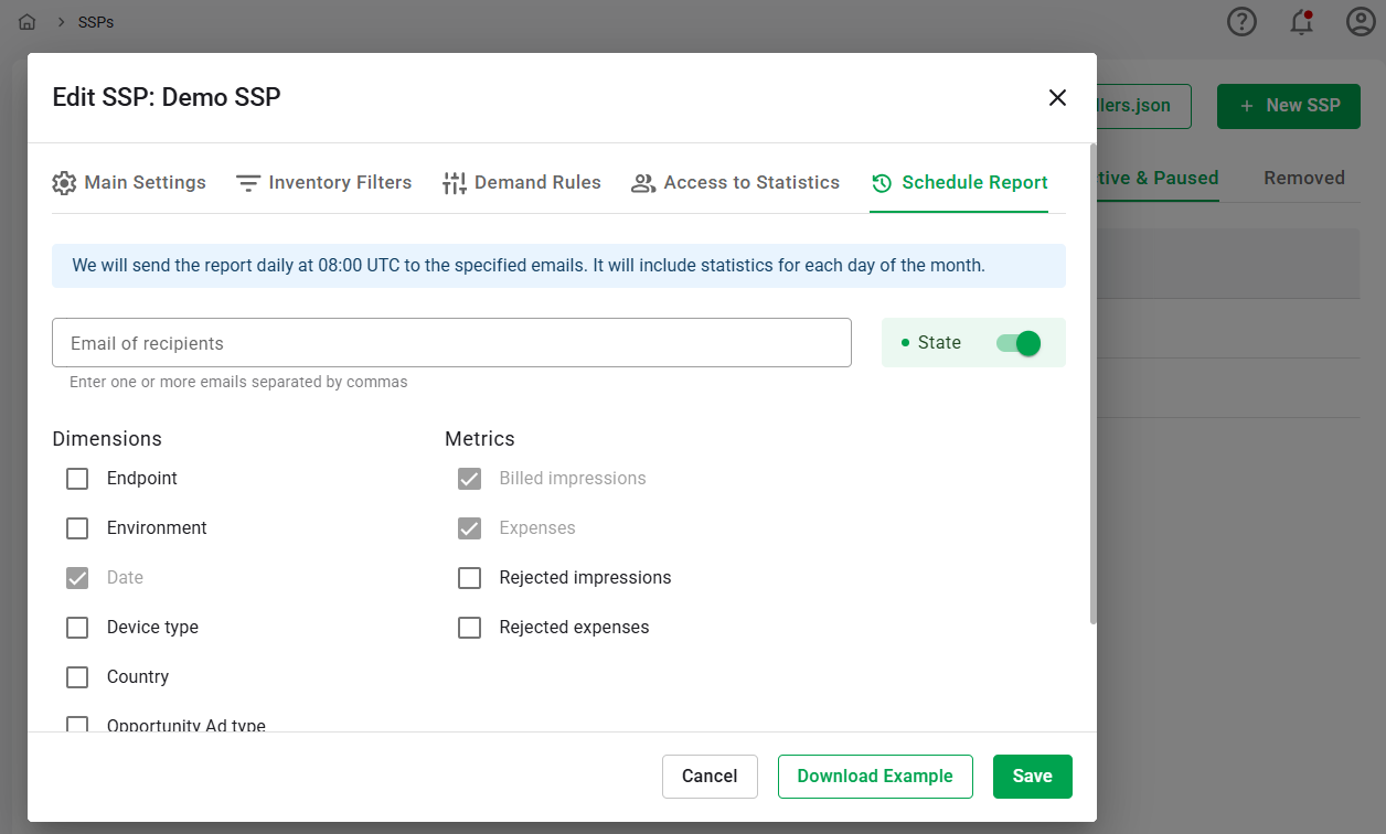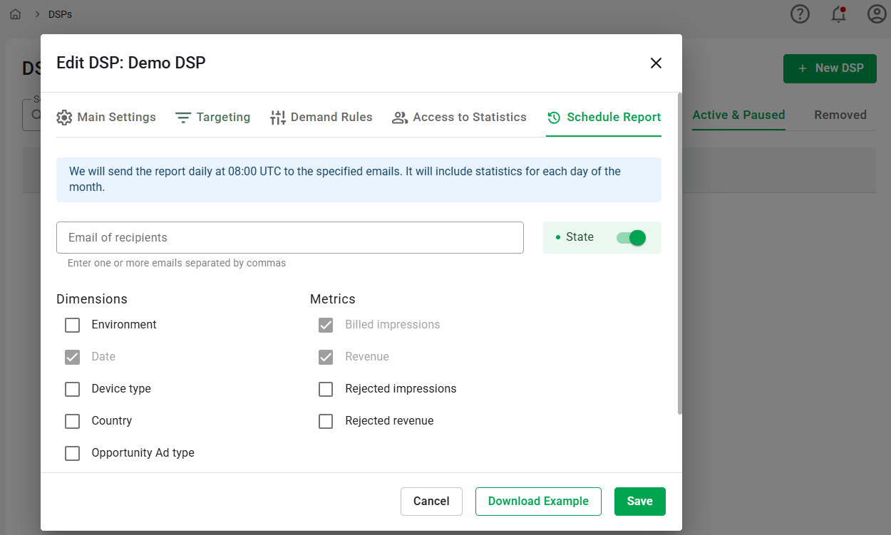 This guide describes how to configure the daily email reporting feature for SSP and DSP clients in RTB-Stack. This feature automatically sends an attached .xlsx file with your chosen metrics and dimensions to specified email addresses each day at 08:00 UTC.
