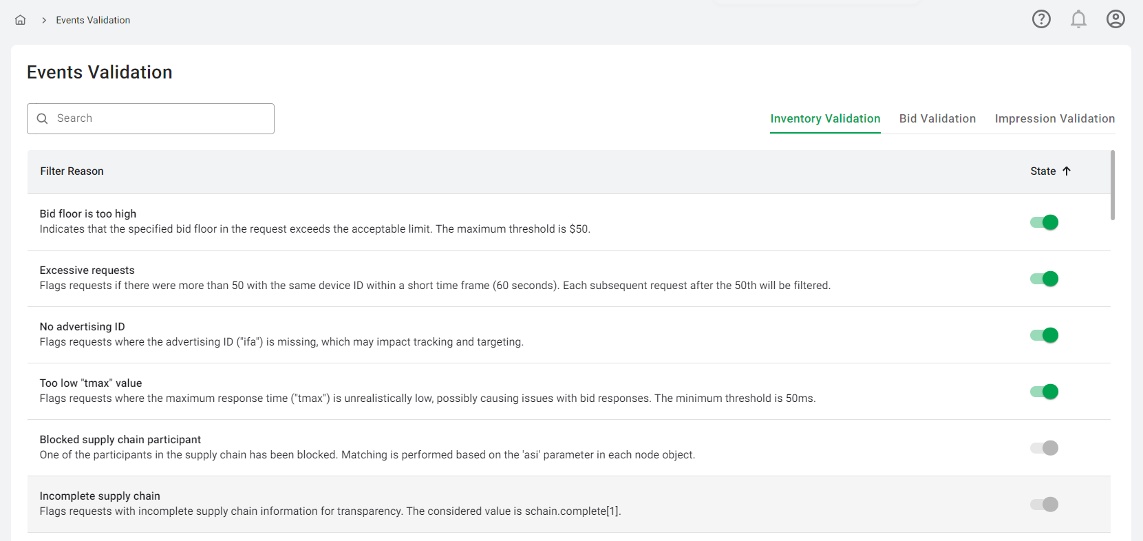 The Events Validation page features three validation tabs: Inventory (assesses the quality of inventory received from SSPs), Bid (evaluates the quality of received bids), and Impression (analyzes the quality of received impressions). Each tab contains a set of filter criteria, some of which are pre-enabled and cannot be deactivated (default filters).