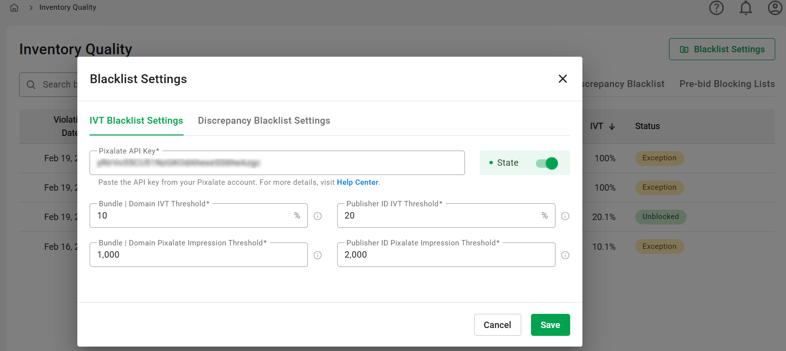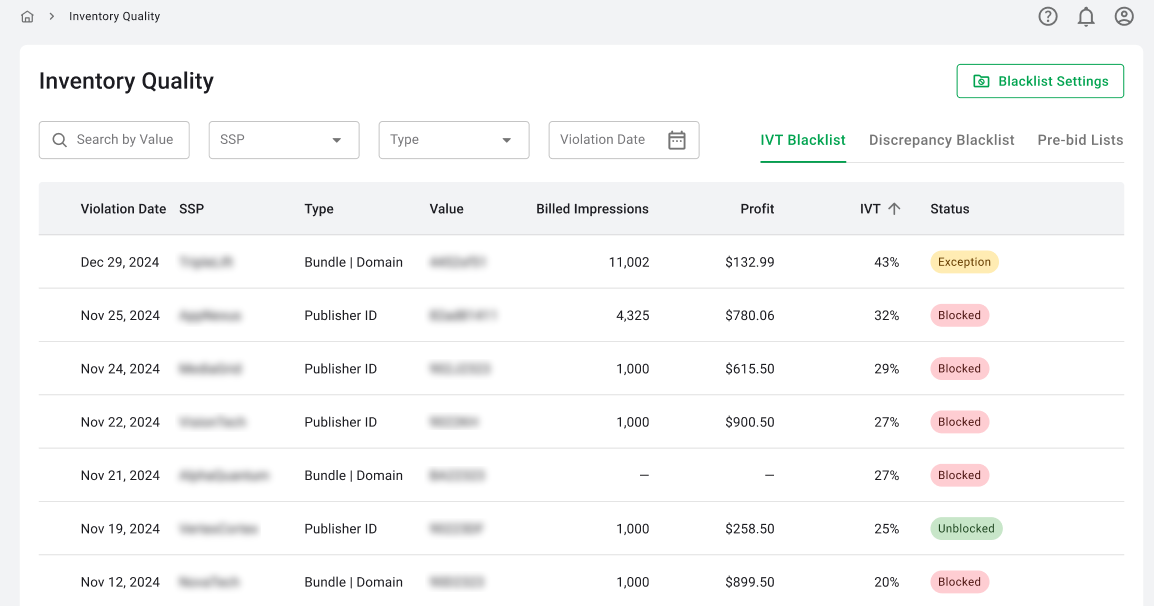 The Pixalate IVT Blacklist is a service that automatically identifies and blocks sources with high levels of invalid traffic (IVT). This ensures that users can maintain high-quality ad inventory by filtering out fraudulent or suspicious traffic.
