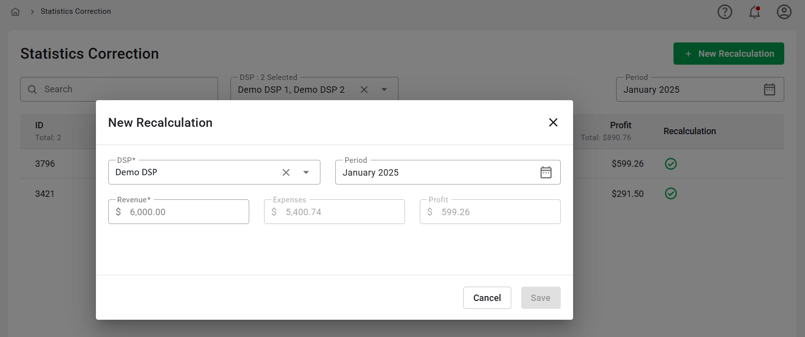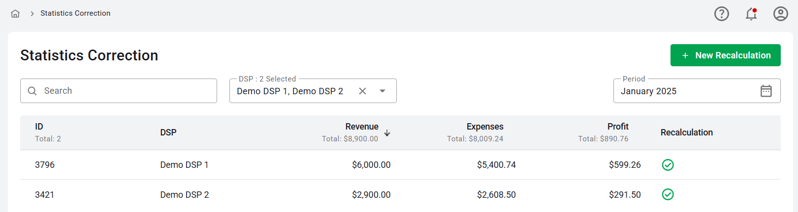 The Statistics Correction feature enables users to recalculate financial data based on final revenue figures received from DSP partners, ensuring accurate reporting of revenue, expenses, and profit. Adjusted values are reflected in reports for consistency.